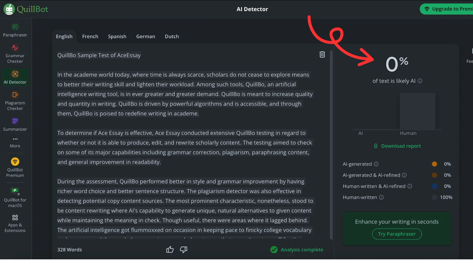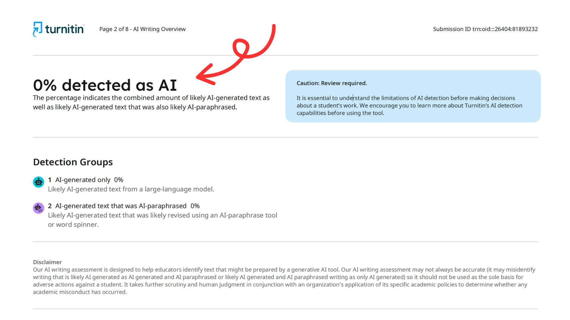 Turnitin でテストした結果、驚きました。SafeWrite AI は、完全に AI で書かれた 956 語の旅行エッセイを、自然な文章に変換します。SafeWrite の「Undetectable」オプションと Turnitin API の統合により、コンテンツを効果的に人間らしく表現できます。